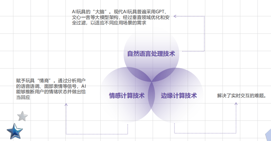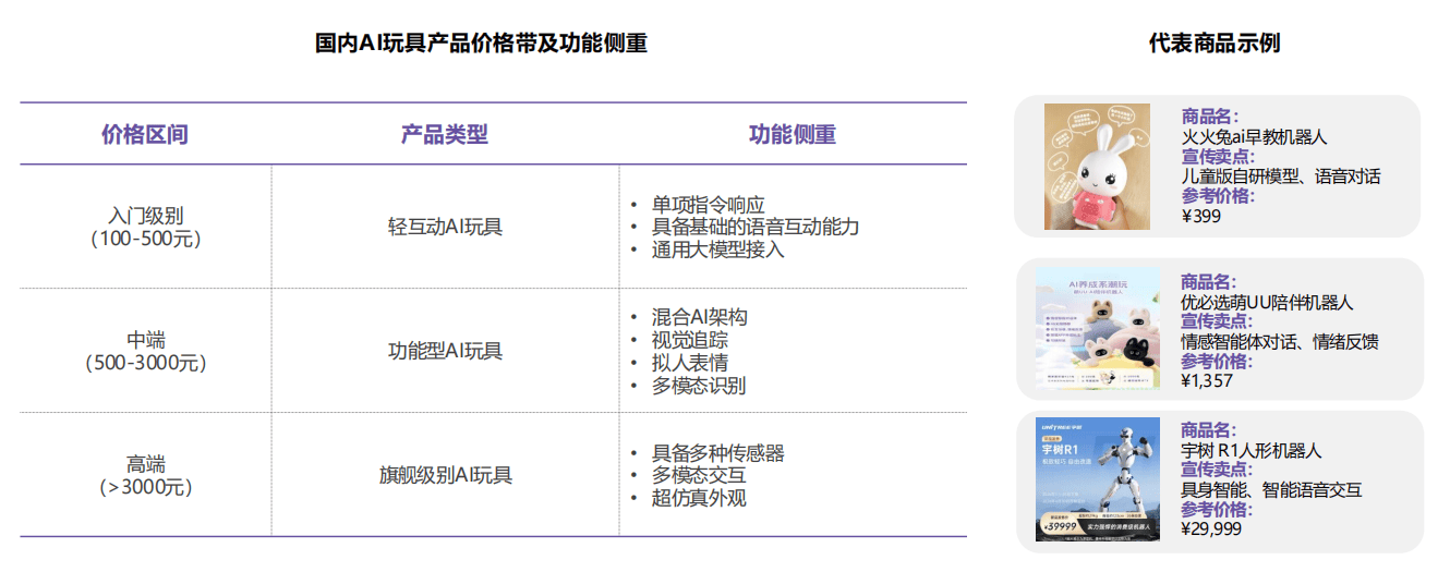 AI玩具的焦点乐趣人群为18-34岁女性。社交对于AI玩具的全体呈现积极、反面的基调,中端价位型则具备多模态识别及夹杂AI架构,